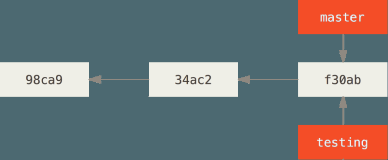 新建testing分支后示意图(未示意HEAD指针和tag)