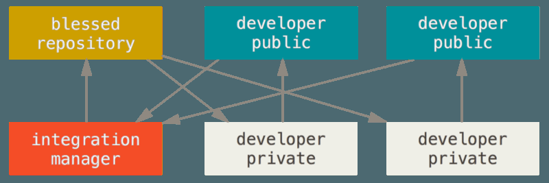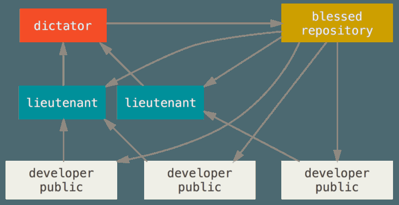 这种工作流程并不常用,只有当项目极为庞杂,或者需要多级别管理时,才会体现出优势。利用这种方式,项目总负责人(即司令官)可以把大量分散的集成工作委托给不同的小组负责人分别处理,然后在不同时刻将大块的代码子集统筹起来,用于之后的整合。