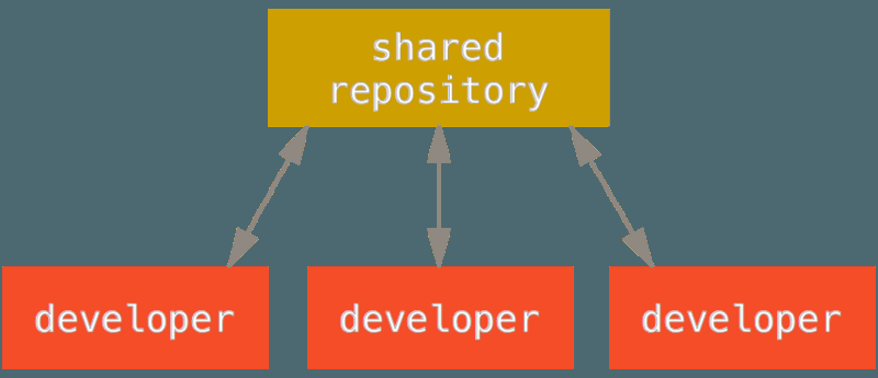 集中式系统中通常使用的是单点协作模型——集中式工作流。一个中心集线器,或者说仓库,可以接受代码,所有人将自己的工作与之同步。若干个开发者则作为节点——也就是中心仓库的消费者——并且与其进行同步。 这意味着如果两个开发者从中心仓库克隆代码下来,同时作了一些修改,那么只有第一个开发者可以顺利地把数据推送回共享服务器。第二个开发者在推送修改之前,必须先将第一个人的工作合并进来,这样才不会覆盖第一个人的修改。这和 Subversion (或任何 CVCS)中的概念一样,而且这个模式也可以很好地运用到 Git 中。 如果在公司或者团队中,你已经习惯了使用这种集中式工作流程,完全可以继续采用这种简单的模式。只需要搭建好一个中心仓库,并给开发团队中的每个人推送数据的权限,就可以开展工作了。Git 不会让用户覆盖彼此的修改。 例如John和Jessica同时开始工作。John完成了他的修改并推送到服务器。接着Jessica尝试提交她自己的修改,却遭到服务器拒绝。她被告知她的修改正通过非快进式(non-fast-forward)的方式推送,只有将数据抓取下来并且合并后方能推送。 这种模式的工作流程的使用非常广泛,因为大多数人对其很熟悉也很习惯。 当然这并不局限于小团队。利用 Git 的分支模型,通过同时在多个分支上工作的方式,即使是上百人的开发团队也可以很好地在单个项目上协作。